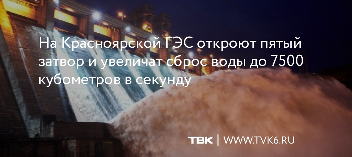 На ГЭС откроют пятый затвор, и расход достигнет 7 тыс. 500 кубометров в секунду. Из-за этого уровень воды в Енисее поднимется на 20-25 см.