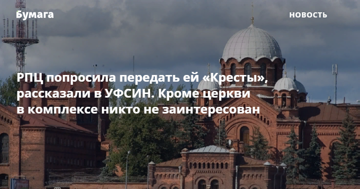 Информацию о том, что в РПЦ попросили передать им «Кресты», подтвердил 47News начальник УФСИН Игорь Потапенко. Он также подтвердил, что никакие другие структуры не заинтересованы в объекте. При этом в Петербургской митрополии изданию сообщили, что впервые слышат о запросе.
