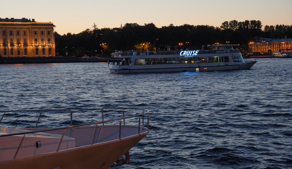 Двухпалубный теплоход «Астра» курсирует по Неве ежедневно по вечерам. Продолжительность прогулки составляет два часа, за это время судно проходит мимо Адмиралтейства, Эрмитажа, Петропавловской крепости и других достопримечательностей. Гостям предлагают живую музыку, смотровую площадку с тентом, а также полноценное меню: с сырным плато, греческим салатом, шашлыками, десертами и другими позициями.