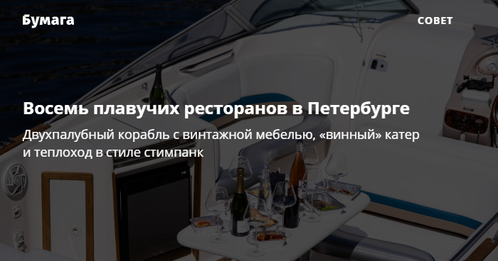 Судоходный сезон в Петербурге в самом разгаре, прогулку по рекам и каналам можно совместить с завтраком, обедом или ужином. «Бумага» рассказывает, в каких плавучих ресторанах послушать фортепианную музыку, выпить вина на верхней палубе и потанцевать под диджей-сеты.