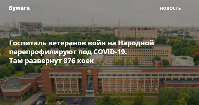 Обновление. В пресс-службе госпиталя ветеранов войн подтвердили, что стационар на Народной улице перепрофилируют под коронавирус. «Фонтанка» сообщает, что там развернут 876 мест для пациентов с COVID-19, так как в городе занято 90 % коек. В пятницу, 11 июня, планируется начать прием больных.
