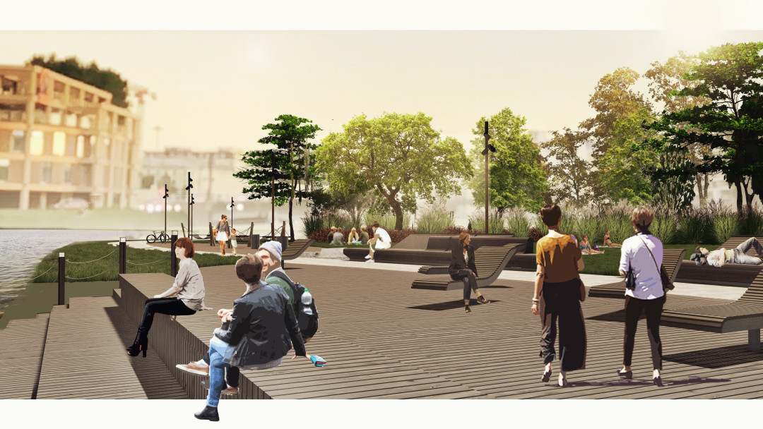 Помимо этого, на набережной высадят кусты для разделения прогулочной зоны от проезжей части. Еще там появятся деревянные площадки: одна — с амфитеатром и ступеньками, спускающимися к воде, две другие — с шезлонгами и гамаками.