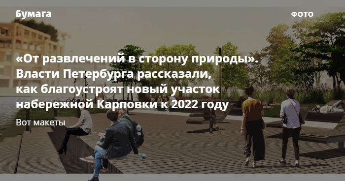 Как говорят в администрации района, запрос жителей «изменился: от развлечений в сторону природы». Поэтому на набережной Карповки обещают оборудовать новое «экопространство с многолетними травами», а также луговой газон для пикников.