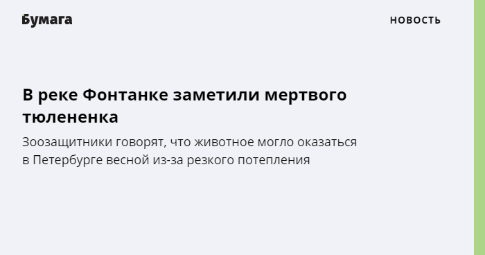 В «Фонде друзей балтийской нерпы» рассказали «Бумаге», что узнали о смерти тюлененка 7 июня. «Состояние трупа такое, что это животное, которое погибло не день, не два, не три назад. Минимум неделя, а то и больше», — сказали зоозащитники. Они предположили, что это один из тюленят, которые весной оказались в реках и каналах Петербурга и которых не нашли.