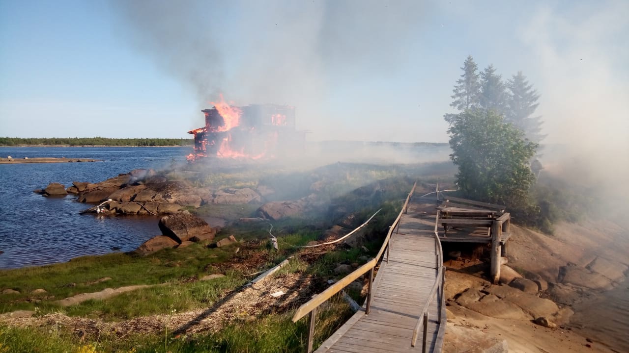 Пожар в строении на берегу Белого моря начался вчера вечером в 17:39. Пожарных вызвали очевидцы.