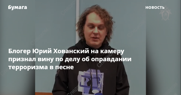 Следственный комитет России опубликовал на ютьюбе видео, на котором петербургский блогер Юрий Хованский (4,4 миллиона подписчиков) признает вину по делу об оправдании терроризма.