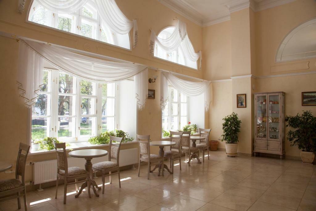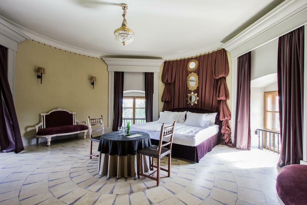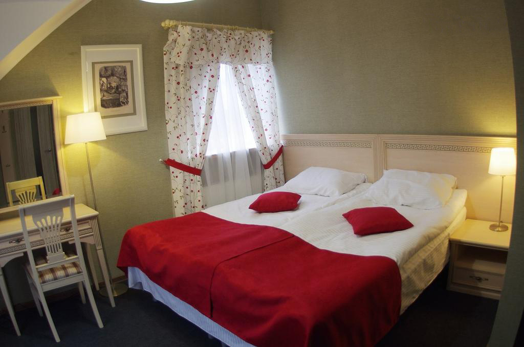 Остановиться можно в главном здании поместья — старинном двухэтажном особняке с бельведером, увенчанным шпилем. К сожалению, интерьеры номеров никак не напоминают о былых эпохах, но этот недостаток вполне компенсирует вид имения и окружающего его садово-паркового ансамбля с прудами, гротом и охотничьим домиком.