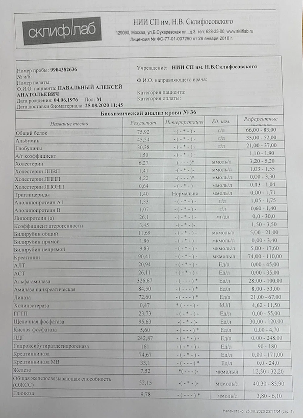 При этом они обнаружили, что в официальной версии комплекта медицинских документов отсутсвует биохимический анализ крови из НИИ Склифосовского, в котором зафиксировано критическое снижение уровня холинэстеразы. Это, как подчеркивают соратники Навального, в совокупности с другими симптомами, описанными в медкарте,