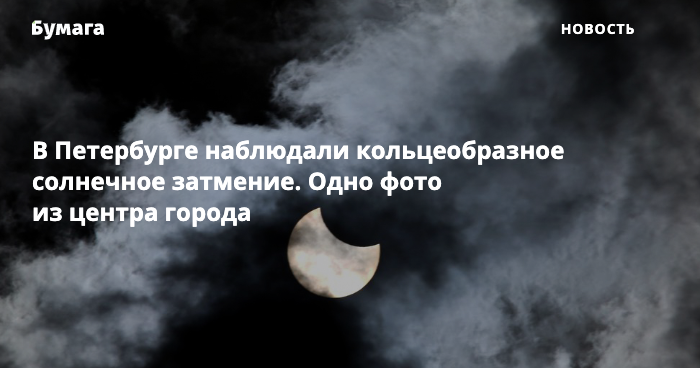 В Петербурге 10 июня наблюдали одну из фаз кольцеобразного солнечного затмения. Это редкое астрономическое явление, которое происходит, когда Луна и Земля располагаются на максимальном или близком к максимальному расстоянии друг от друга. В 14:12 Луна закрыла Солнце на 25 %. «Бумага» показывает фотографию затмения, сделанную на площади Восстания.