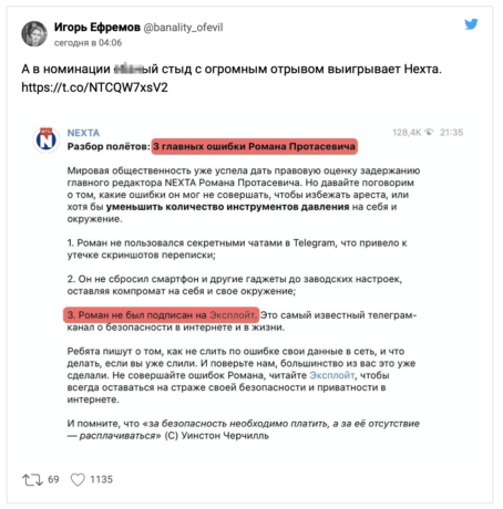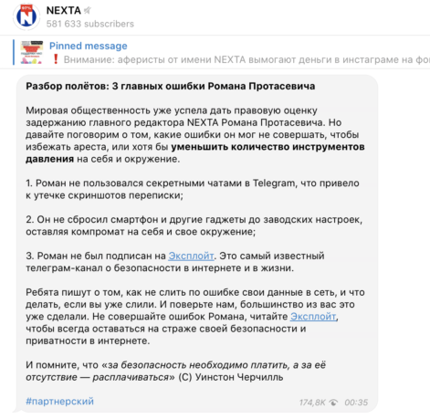 Телеграм-канал Nexta выложил партнёрский пост, где прорекламировал сообщество о кибербезопасности на примере «главных ошибок Романа Протасевича». В публикации говорится, что «Протасевич мог бы избежать ареста», если бы пользовался секретными чатами, сбросил смартфон и «подписался на „Эксплойт“».
