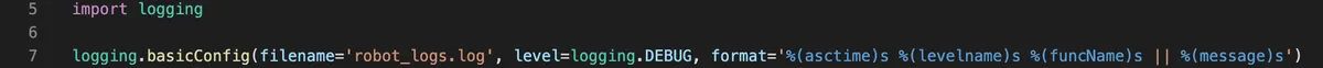 Перейдем к коду, который создает робота. Мы снова импортируем библиотеку logging и создаем файл с логами. Дадим ему имя, установим уровень DEBUG и отформатируем сообщение, которое будет выведено в логах. В примере, который я показывала, мы видели в лог-файле минимум информации. Теперь мы хотим сделать эту информацию более читаемой. Это делается с помощью format. В нем мы прописываем параметры, которые хотим видеть в сообщении: например время, когда действие выполнилось, уровень сообщения, название функции, которая выполняется в этот момент, и наше сообщение. Весь список этих атрибутов можно увидеть в документации библиотеки logging.