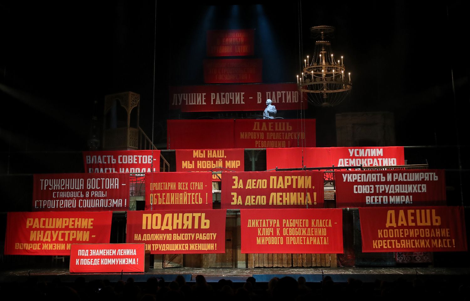 Она в ответ зачитывает письмо, видимо, уже умершего Ленина, где говорится, что «Сталин слишком груб». После этого на сцене появляется сам Иосиф Сталин (актер Георгий Иобадзе), который успокаивает паникующего Григория Зиновьева, саркастически предлагает ему договориться со Львом Троцким, а потом — «смотреть в будущее, а не оглядываться в прошлое», потому что «из мавзолея больше писем не будет».