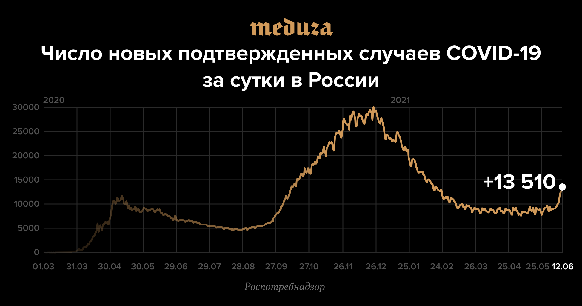 На долю Москвы пришлась почти половина всех выявленных в России за прошедшие сутки случаев заболевания COVID-19. Всего в стране, по состоянию на утро 12 июня, зафиксированы 13510 случаев.