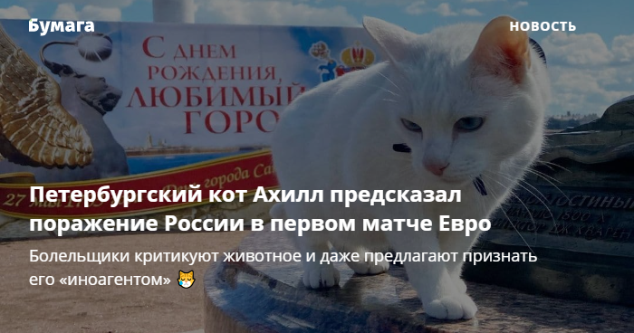 Утром 12 июня петербургский кот Ахилл предсказал победу Бельгии и поражение России в стартовом матче Евро-2020, который начнется в 22:00. Трансляция проходила в официальном инстаграм-аккаунте Ахилла.