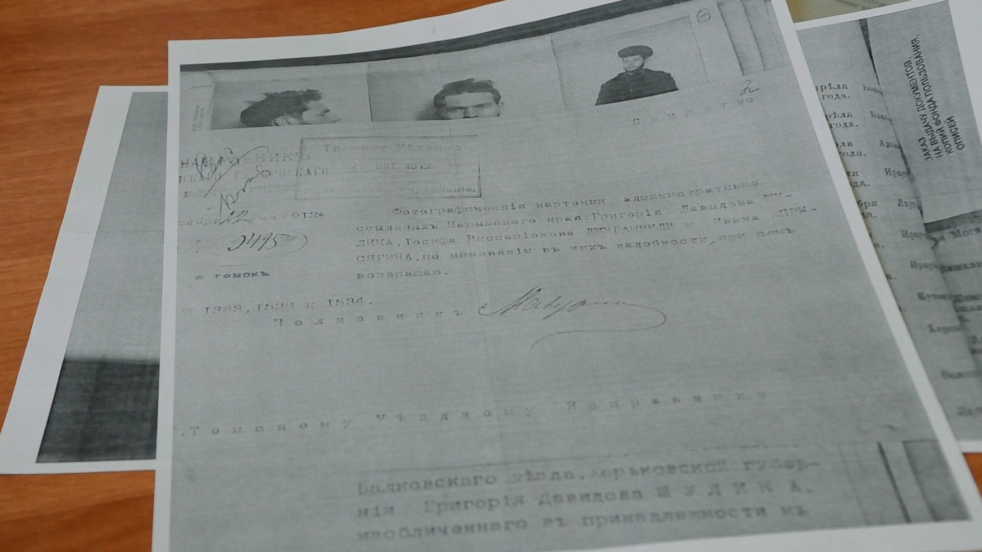 Вот он мой дед и моя мама маленькая. Его отец родился на Алтае. Прадед Федор Титков служил в Нарыме, был старшим полицейским надзирателем за административными ссыльными революционерами. У него под надзором сидели Куйбышев, Рыков, Джугашвили. Вот то, что я нашел про Сталина в архиве – это полицейский альбом. Джугашвили Иосиф Виссарионович, и Дзержинский на той же странице. Это что-то типа "их разыскивает милиция". Это альбом переписи всех, кто в Нарыме сидел: Рыков – 1913 год, 1910 год – Куйбышев, 1910 год – Свердлов, 1912 год – Джугашвили. Он всего 40 дней был в 1912 году, через 40 дней он сбежал.