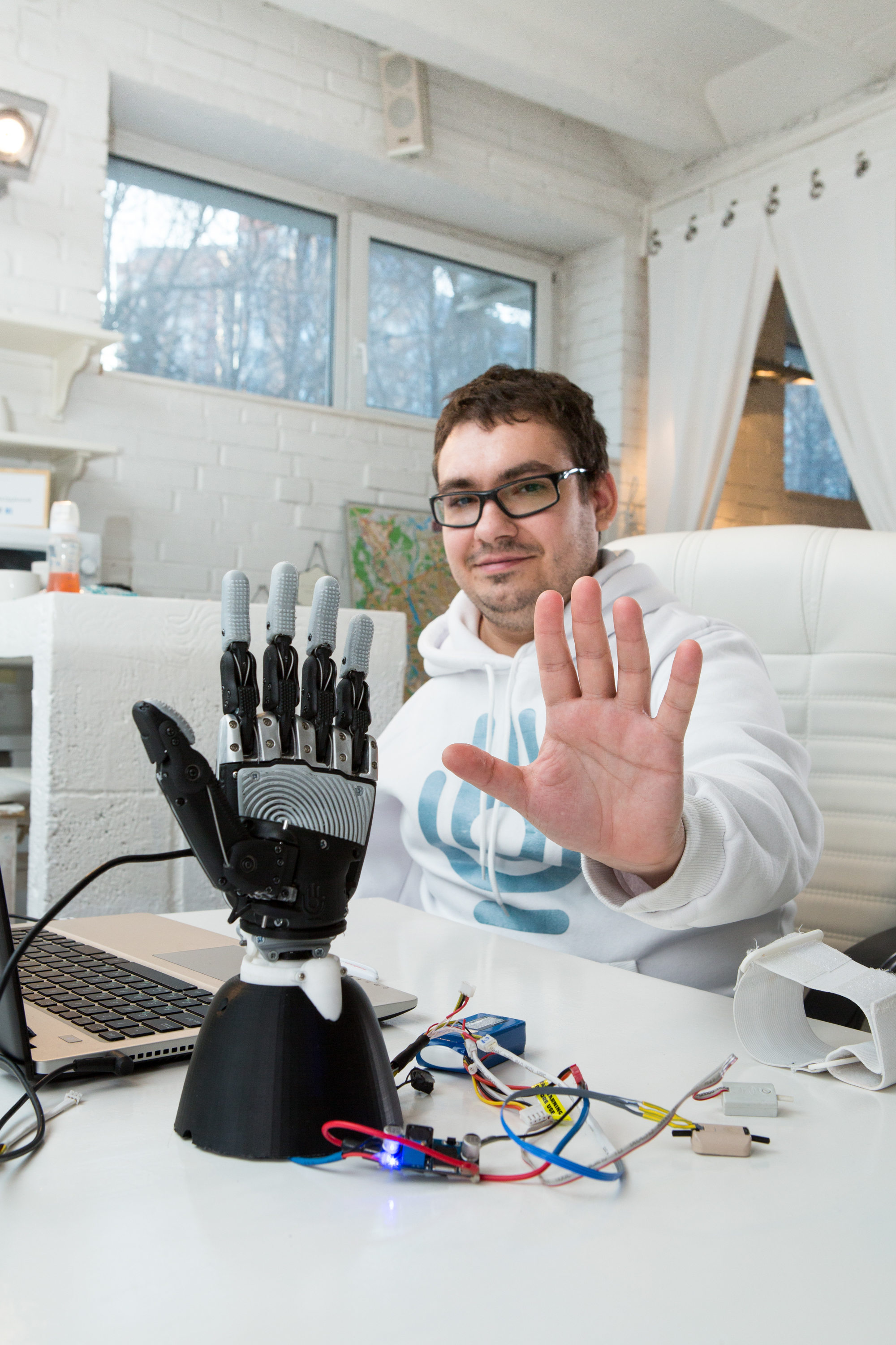 – Я бы никогда столько не накопил. Поэтому решил: попробую сделать сам. В России тогда никто не делал бионических протезов, но я поставил себе именно такую задачу. Принцип их работы основан на том, что у человека, потерявшего конечность, сохраняется фантомное ощущение руки. Я, например, до сих пор чувствую свою правую руку и инстинктивно пытаюсь что-то ею взять, пошевелить пальцами. Мышцы в предплечье начинают сокращаться, датчики бионического протеза фиксируют электрический потенциал мышц. Так они "понимают": человек хочет сжать руку или разжать ее – и делают это. Вот такой протез я и решил создать.