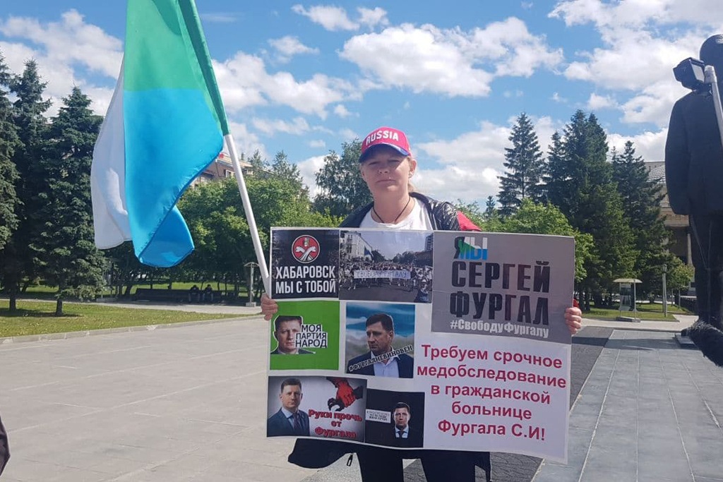 Яна Дробноход вышла в центр Новосибирска 12 июня с плакатом в поддержку арестованного хабаровского экс-губернатора Сергея Фургала. Она потребовала срочного обследования политика в гражданской больнице.