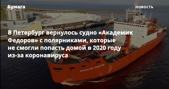 В Петербург вернулось судно «Академик Федоров» с зимовочным составом 65-й антарктической экспедиции, часть людей из которой не смогла попасть домой в 2020 году из-за коронавируса. Об этом сообщает телеграм-канал «Лед».