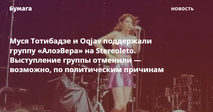 Муся Тотибадзе и Oqjav поддержали группу «АлоэВера» на фестивале Stereoleto. Выступление группы отменили — возможно, по политическим причинам