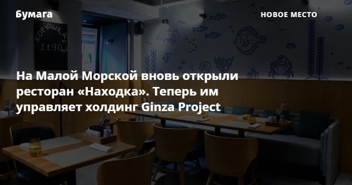 На Малой Морской улице, 18 вновь открыли рыбный ресторан «Находка», рассказали «Бумаге» представители заведения. Ранее «Находка» входила в Well Group, теперь рестораном управляет холдинг Ginza Project.