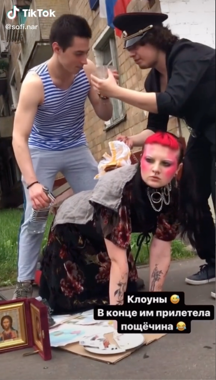 Ранее «Москва 24» выпустила сюжет, в котором показала , снятый на Нагорной улице. В оригинальном ролике девушка стоит возле икон Божией Матери и Иисуса Христа на четвереньках, имитируя стол. Двое юношей чокаются над ней стаканами и пьют на брудершафт, предположительно, водку.