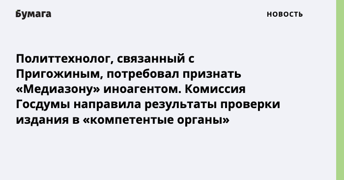 Политтехнолог, связанный с Пригожиным, потребовал признать «Медиазону» иноагентом
