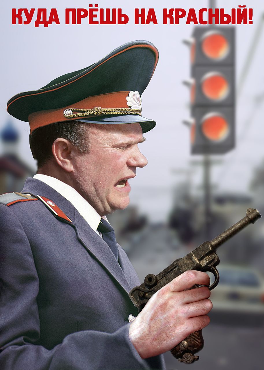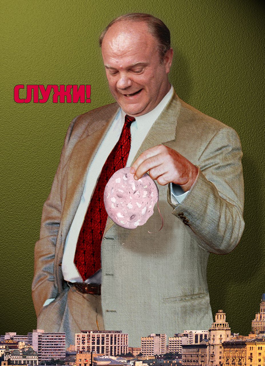 — Ржавенький такой, на кучку говна похож, действительно. Впрочем, разницы никакой. Был еще плакат, на котором Зюганов кусок любительской колбасы держал над городом, и текст был такой: «Служи!»