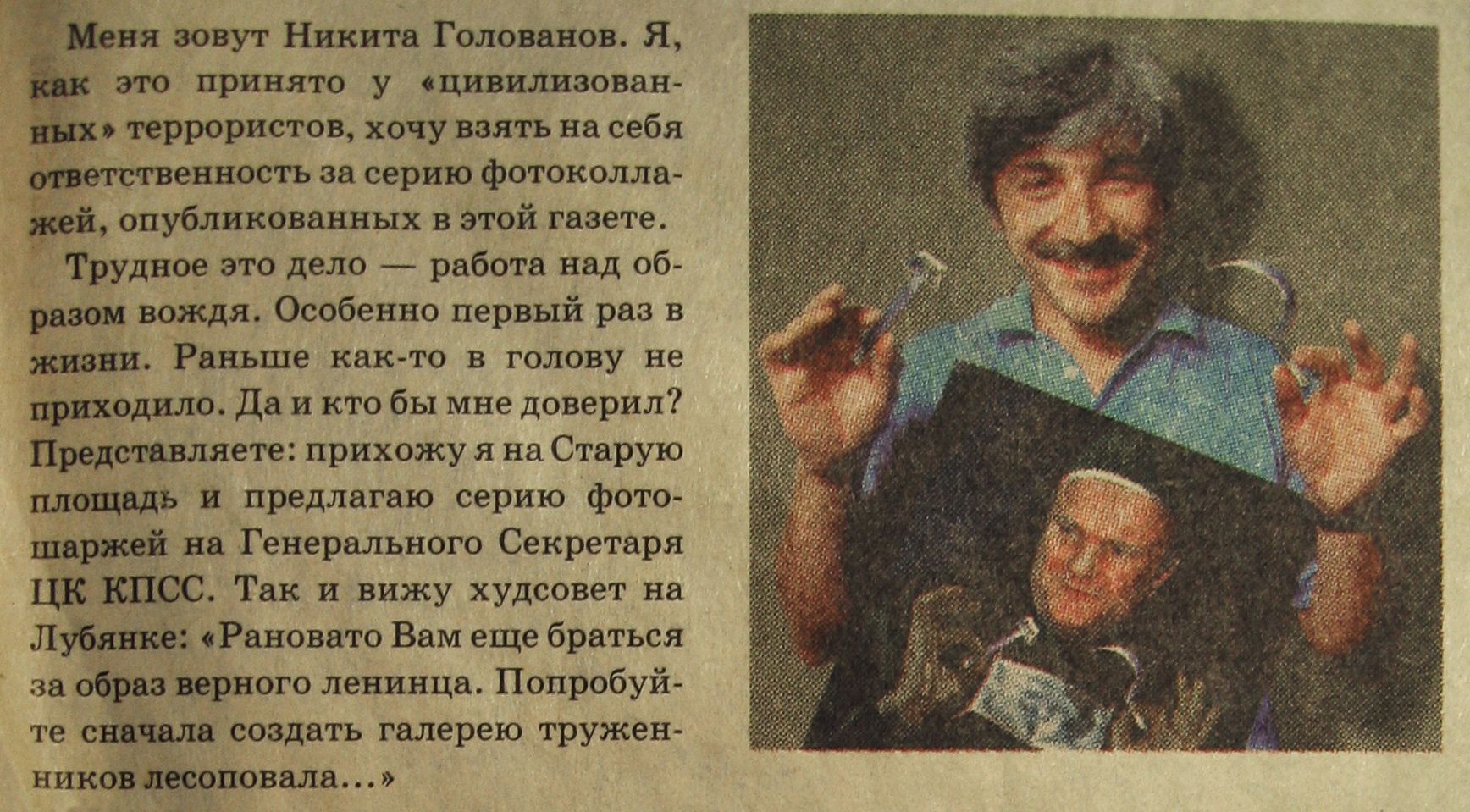 — Выходных данных действительно поначалу не было, а знали ли тогда читатели, что «Не дай бог!» печатает «Коммерсант», я не знаю. Наверное, были тогда какие-то СМИ, которые нас разоблачали. Я помню только, что в последнем номере мы все писали такие персональные покаянные записочки — я, такой-то, отвечал в «Не дай бог!» за это. С портретами, данными. Я писал, что, как принято у террористов, беру на себя ответственность за плакаты.