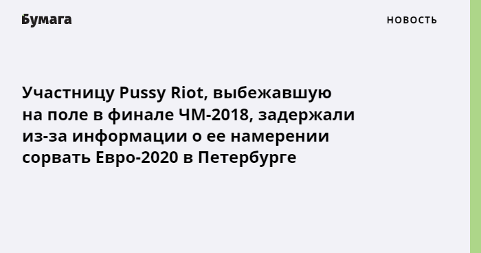 Сотрудники полиции объяснили задержание участницы Pussy Riot Вероники Никульшиной утром 16 июня информацией о ее намерении сорвать Евро-2020 в Петербурге. Об этом пишет «Интерфакс» со ссылкой на адвоката Сергея Тельнова.