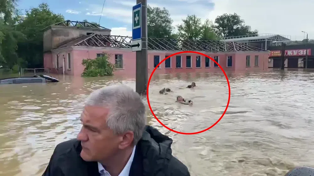 В город приехал глава Крыма Сергей Аксенов. Осмотр улиц он начал, передвигаясь на надувной лодке. В отрывке из трансляции телеканал «Крым 24» заметно, как за лодкой с Аксеновым плывут три человека. Глубина затопления, судя по видео, выше пояса.