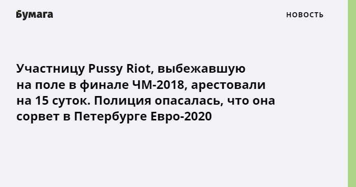 Участницу Pussy Riot, выбежавшую на поле в финале ЧМ-2018, арестовали на 15 суток. Полиция опасалась, что она сорвет в Петербурге Евро-2020