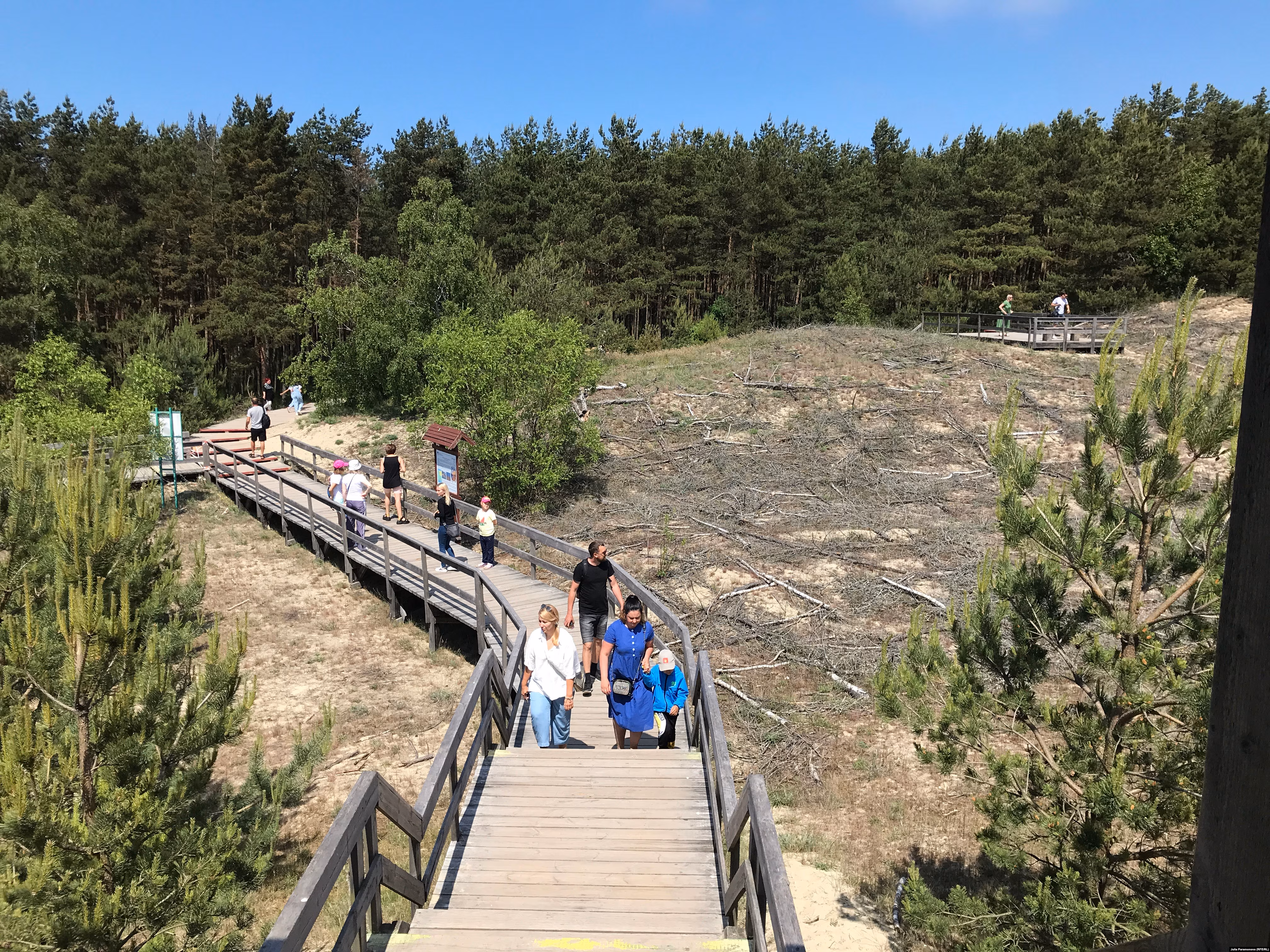 На число туристов не влияет день недели – только погода. В солнечный четверг на въезде привычная пробка из автобусов и легковых автомобилей. На экотропе "Высота Эфа", где можно полюбоваться заливом, дюнами и лесом с 60-метровой высоты, транспорт припаркован по обе стороны узкой дороги. Стоянка полностью забита. В биотуалеты – очереди. А на самой экотропе по деревянным настилам потоком идут люди.