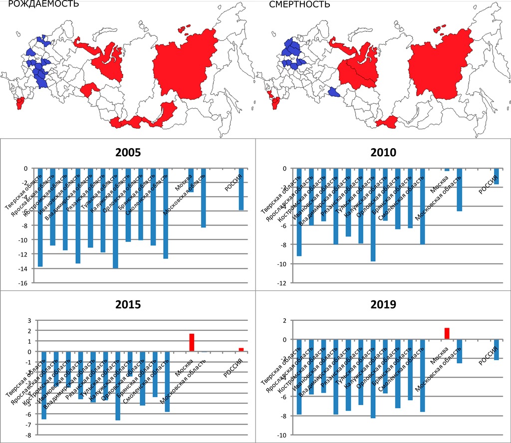 Если же мы посмотрим на статистику естественного прироста, то увидим, что ни разу ни один из этих регионов не смог избежать естественной убыли населения — то есть смертность всегда превышала рождаемость. Причем, например в 2019 году даже в лучших из регионов — Калужской и Костромской областях — естественная убыль населения составила 5,6−5,7 человек на 1 тыс. жителей в год. Этот показатель хуже показателей всех стран мира кроме Болгарии. В самой проблемной Тульской области естественная убыль населения составляла в том же году 8,3 чел/1000 жителей в год, а в Тверской и Ивановской приближается к 8.
