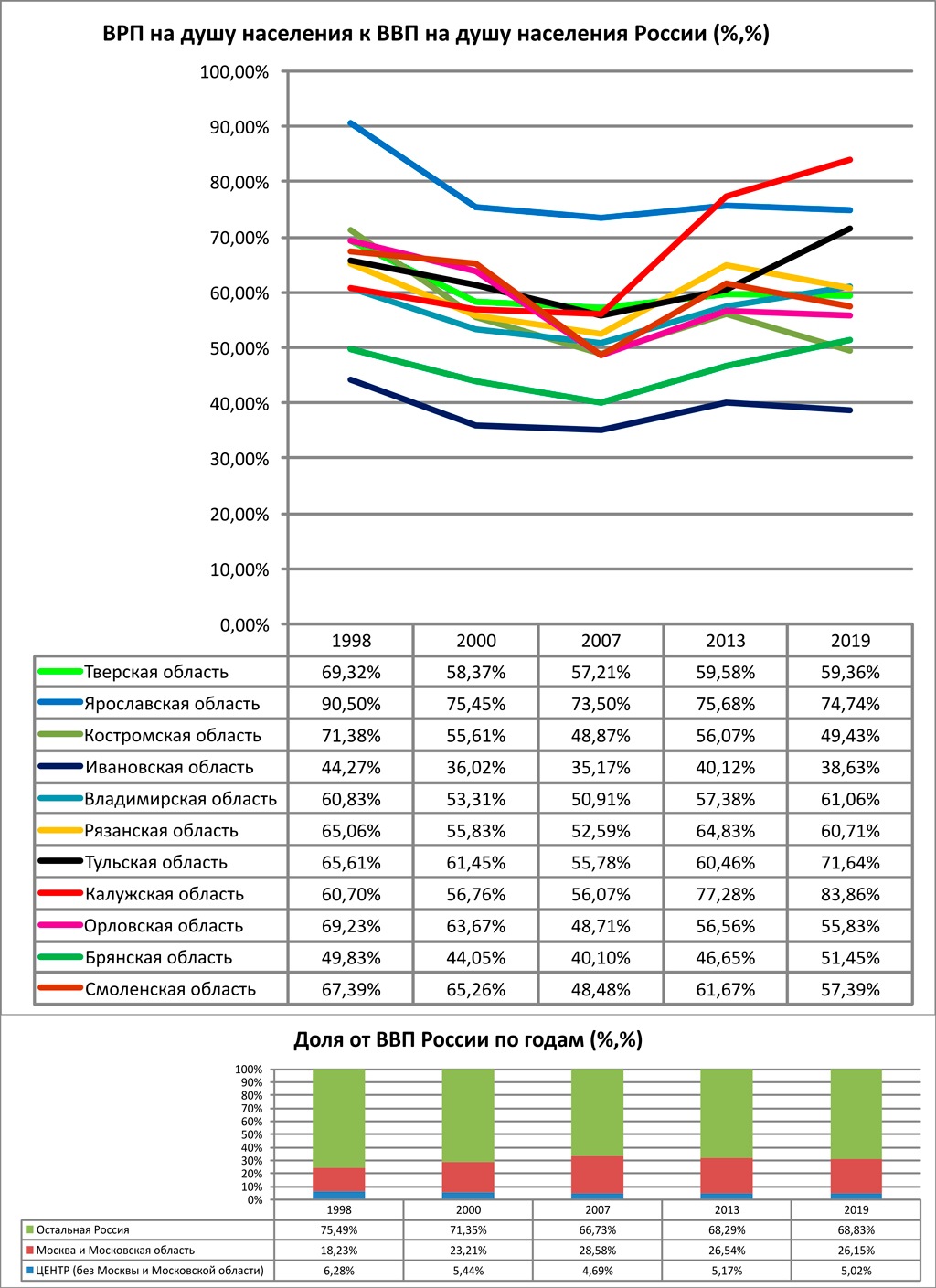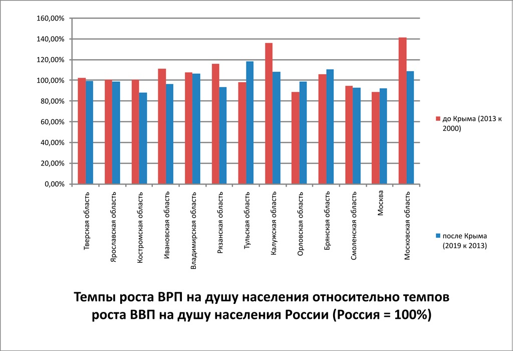 Так, если мы посмотрим на период с 2000 до 2013 год включительно (то есть докрымскую путинскую Россию), то увидим, что темпы роста экономики 8 из 11 рассматриваемых регионов развивались быстрее, чем экономика страны в среднем. Причем, если Ярославская и Костромская показали превышение темпов роста душевых показателей ВРП на ростом душевых показателей ВВП страны в пределах статистической погрешности (то есть учитывая демографию — только за счет вытеснения «лишнего» населения в Московский регион), то экономика Тверской области в пересчете на душу населения росла на 2% быстрее России, Брянская и Владимирская на 5−7%, Ивановская на 11%, Рязанская на 16%, а привлекшая огромное количество инвестиций Калужская область на 36%. В то же время душевые показатели экономики Тульской области росли медленнее общероссийских на 2%, Смоленской на 5%, а Орловской на 11%.