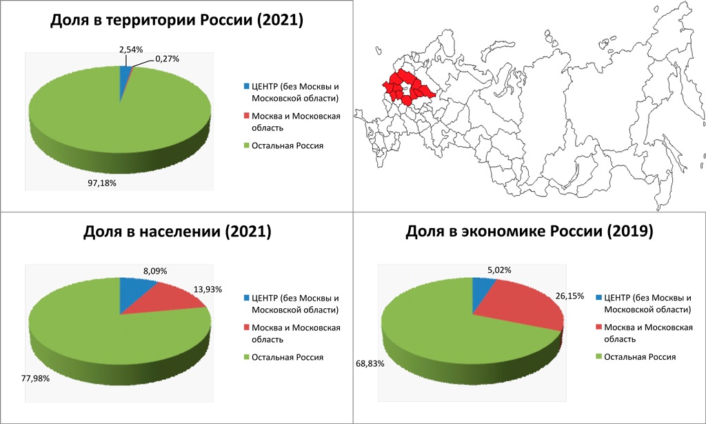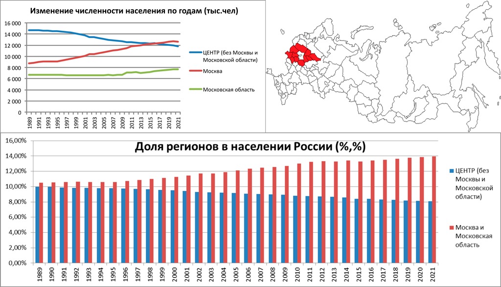 В целом, как мы видим, рассматриваемые нами регионы, занимают всего 2,5% территории России, концентрируют только около 5% ее экономики и 8% населения. Причем последний показатель за последние 30 лет снизился с 10%. В абсолютных показателях за постсоветский период исторический центр русских земель потерял без малого 3 миллиона человек. Так, если в 1991 году здесь проживало 14,7 млн человек, то на начало 2021 года осталось 11,8 млн. При этом за тот же промежуток времени население Москвы выросло с 9 до 12,7 млн человек, а Московской области с 6,7 млн до 7,7 млн.