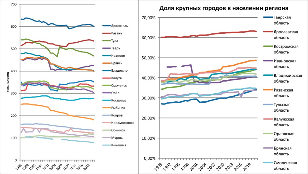 При этом население Ярославля и Костромы снизилось на 2−5%, Твери и Смоленска на 5−10%, Тулы, Брянска и Орла на 10−15%, Иваново, Новомосковска (Тульская область), Мурома и Коврова (Владимирская область) на 15−20%, а Рыбинска (Ярославская область) почти на 30%. Кинешма Ивановской области потеряла без малого четверть населения даже перешла из категории крупных городов в категорию средних.