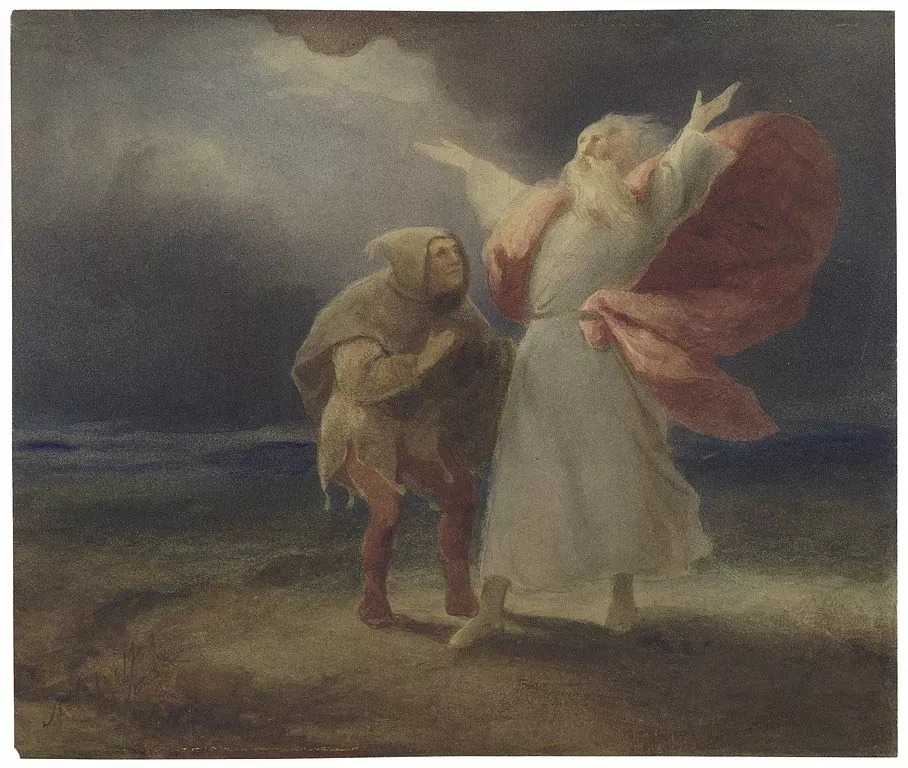 То есть Лир отталкивается от конкретной ситуации, его вопрос обретает обобщающий характер, здесь речь идет о знании сущности человека, знании его места в обществе, его достоинстве. Властный, избалованный властью король Лир в первой сцене, которого, как он скажет потом сам, все ласкали, как собачку, и уверяли, что он сильнее всех, — такой король в первой сцене задать подобный вопрос не смог бы. Здесь опять возникает очень характерный для этой трагедии парадокс: лишаясь придворной пышности, падая вниз с высоты власти на дно общества, герой в то же время в своем душевном развитии начинает расти, движется вверх, начинает постигать мудрость, у него начинает открываться истинное зрение. Это зрение и эту мудрость он начинает обретать, оказавшись в безлюдной степи. Уже тогда ему угрожает надвигающееся безумие. Буря есть и в Книге Иова, но в шекспировской трагедии она имеет другой смысл. В библейской книге буря — это традиционный для Ветхого завета атрибут эпифании, таинственного и страшного для человека богоявления. Из этой бури Бог отвечает Иову. У Шекспира же в духе ренессансной эстетики гроза в степи как бы проецирует во Вселенную, в макрокосм, душевную бурю, острый разлад в микрокосме, то есть в сознание героя. «Король Лир» взорвал многие привычные представления, в том числе представление о пасторали. В других пьесах Шекспира герои уходили в Арденнский лес, где, столкнувшись с природой, перерождались.