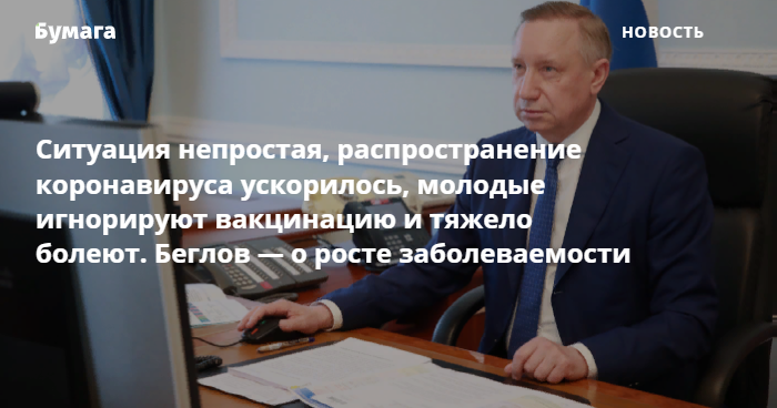 Губернатор добавил, что значительную долю тяжелых пациентов в Петербурге сейчас составляют молодые люди. Беглов связал это с тем, что они «игнорируют» возможность вакцинироваться и поздно обращаются к врачам.
