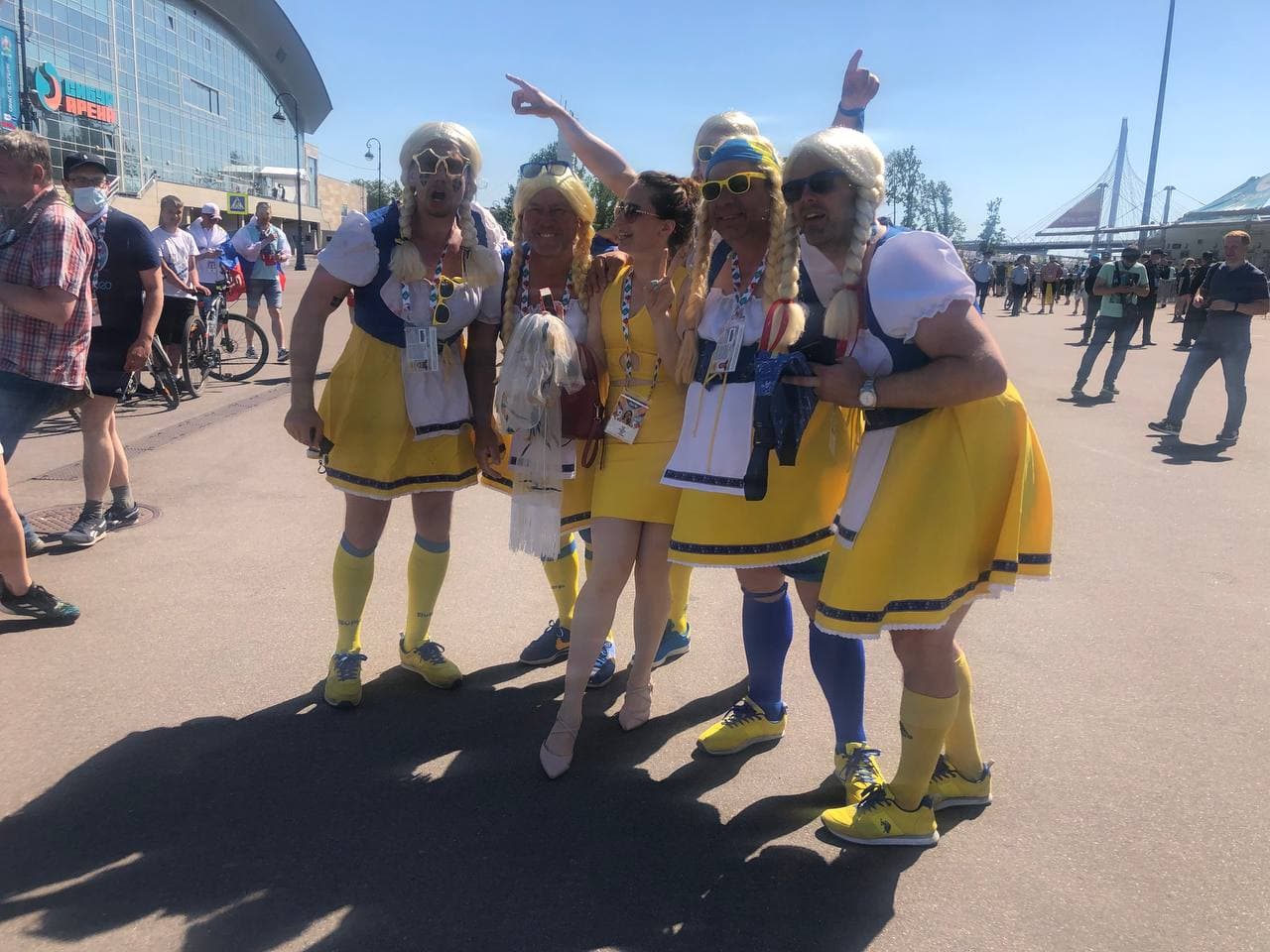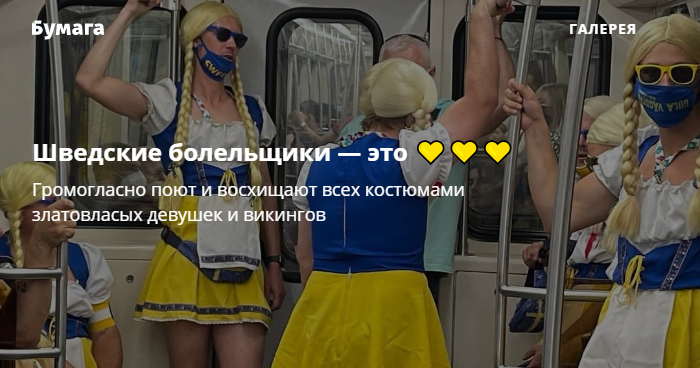 В Петербург приехали шведские болельщики — поддержать свою сборную в матче со Словакией. И это уже одна из самых ярких частей Евро-2020 в Петербурге. Шведы заполнили Крестовский остров, раскатисто поют национальные песни, позируют в костюмах викингов и Пеппи Длинныйчулок, а суровые скандинавские мужчины едут на метро в юбках и в париках с косичками. «Бумага» собрала видео и фотографии с фанатами.