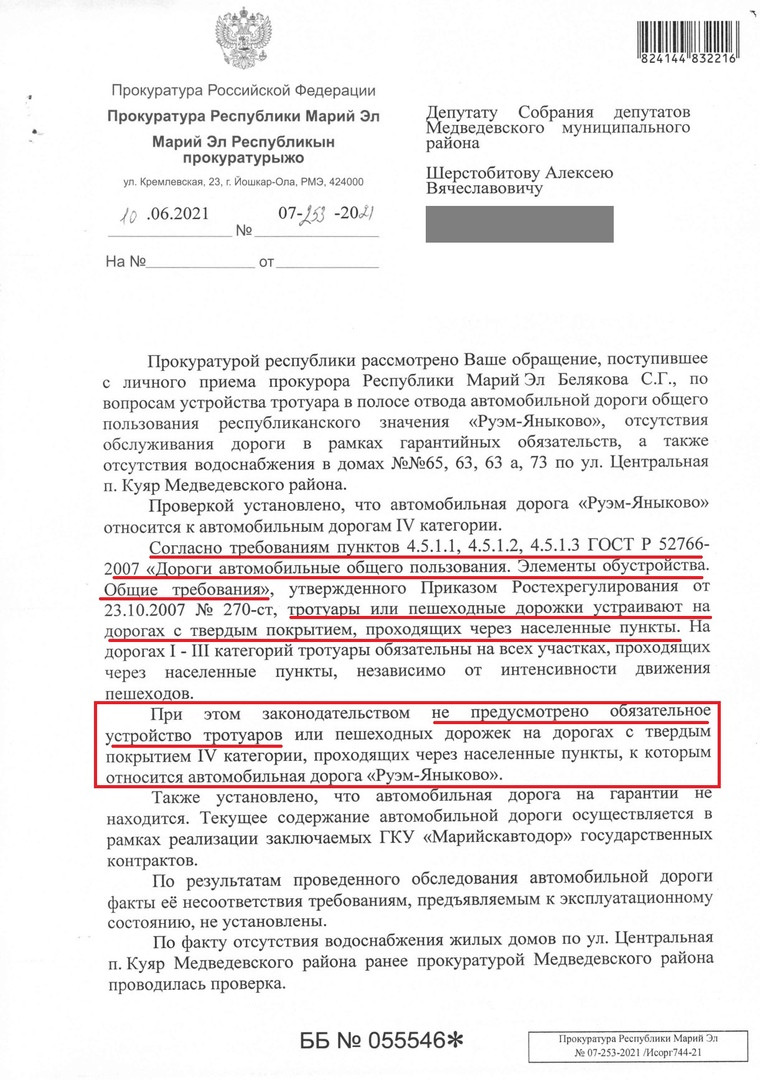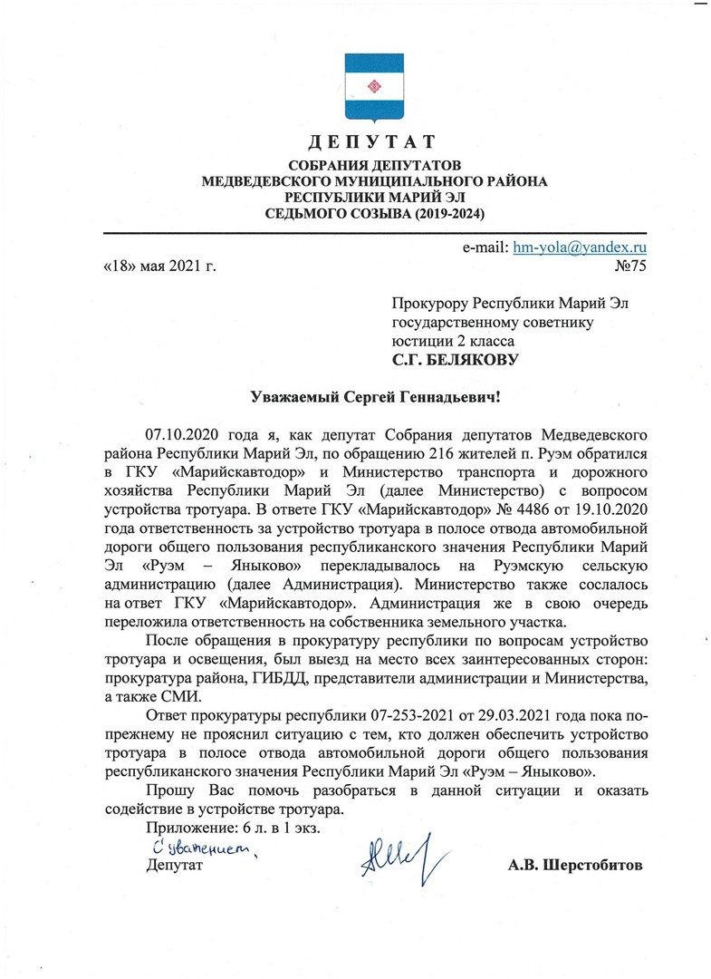 После обращения в медведевскую прокуратуру уже на личном приеме у прокурора Республики Марий Эл (кроме других вопросов) также поднял вопрос - кто же все-таки ответственен за устройство тротуара в данной ситуации?