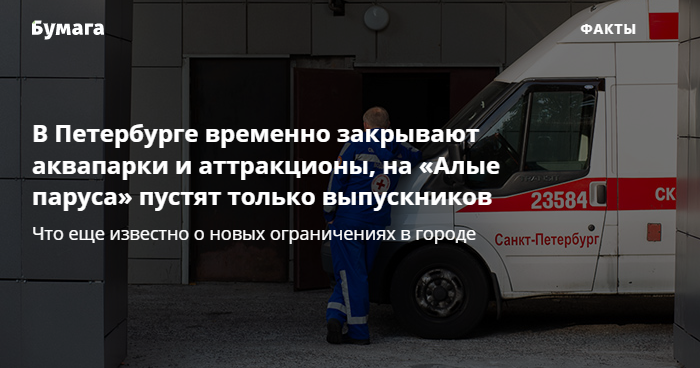 В Петербурге из-за пандемии коронавируса вводят дополнительные ограничения. Временно закрывают аквапарки и аттракционы, а на торжественные мероприятия с более чем 75 участниками будут пускать только при отрицательном ПЦР-тесте. Ряд правил коснется праздника «Алые паруса»: в частности, на него пустят только выпускников.