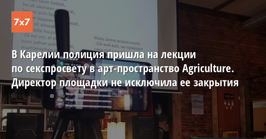 В Петрозаводске вечером 18 июня полицейские пришли в арт-пространство Agriculture Club, где в это время проходил лекторий «Умная пятница», посвященный секспросвету. Поводом для визита силовиков стал «сигнал» о нарушении коронавирусных ограничений. Об этом «7х7» сообщила директор Agriculture Club Наталья Ермолина. Она заявила, что, если давление на площадку продолжится, она предпочтет ее закрыть.