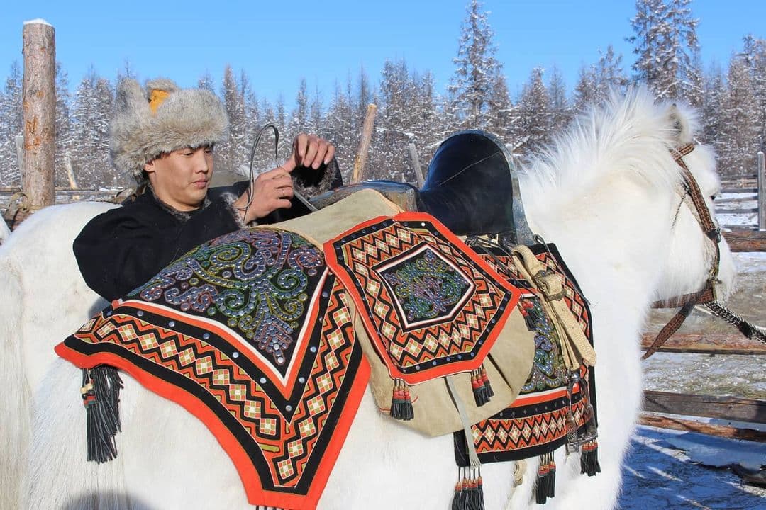 В национальных одеждах 30-летние Дугуйдан и Мичил торжественно выехали из Оймяконского района в начале марта. Из родной местности Дьэкэй их провожали всем улусом: в подготовке экспедиции участвовали жители всех окрестных сел – кто-то помогал изготовить традиционную конскую упряжь, другие собирали продукты, третьи – снаряжение, способное выдержать экстремальные температуры.
