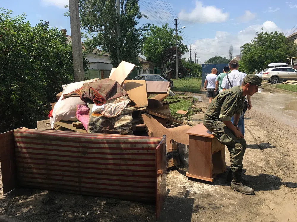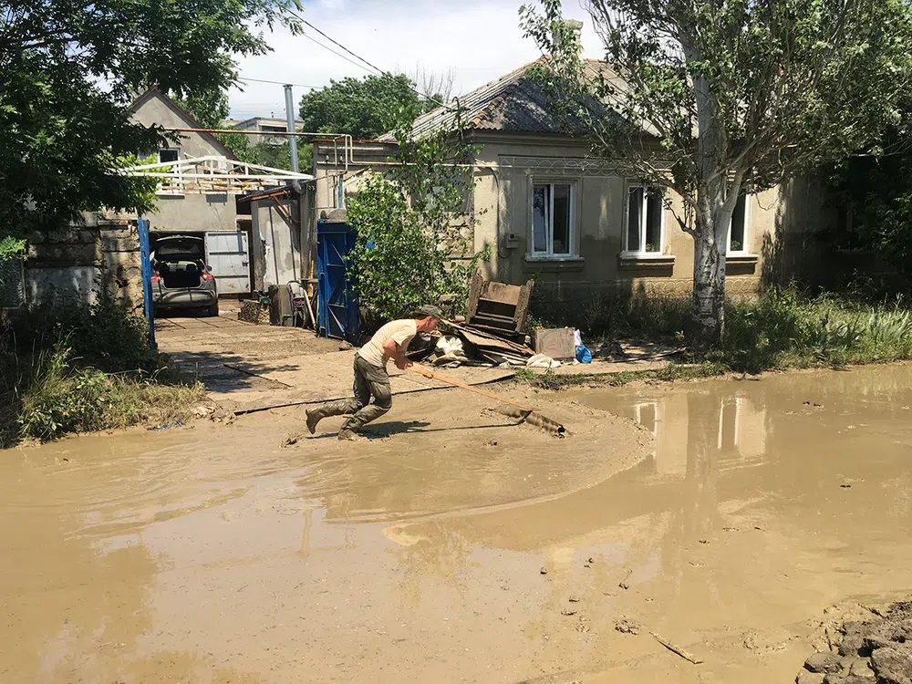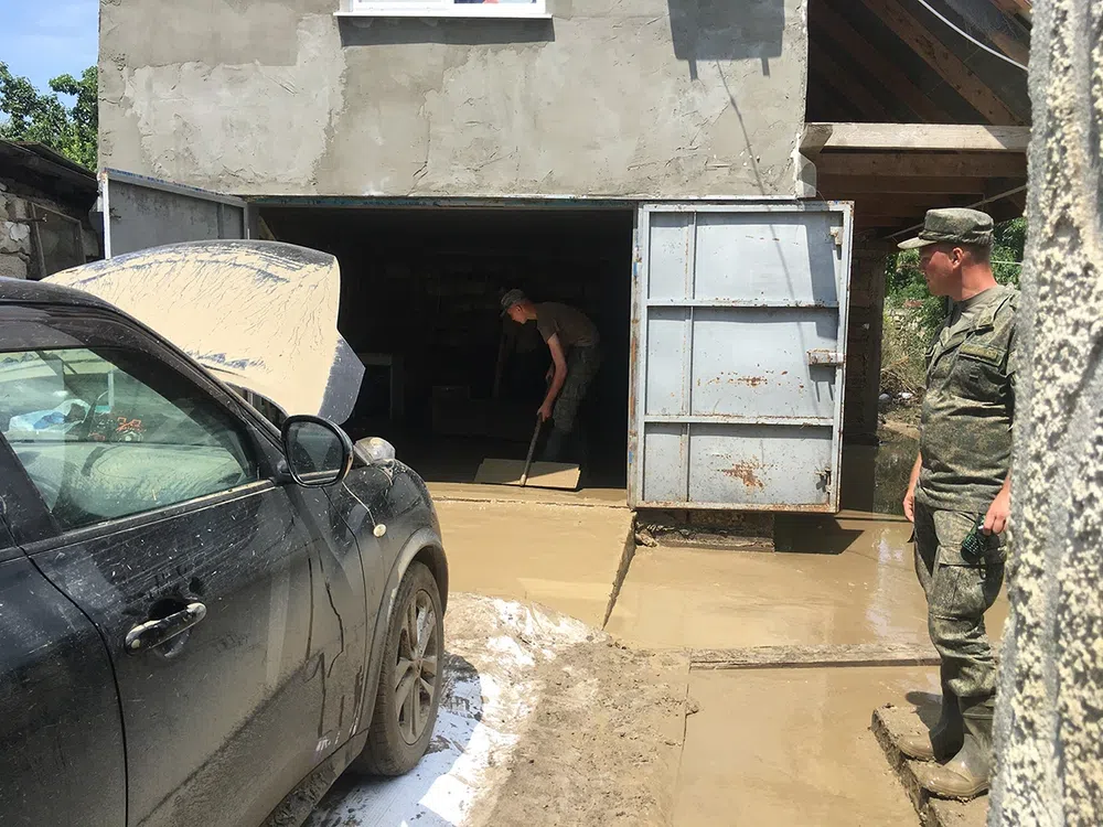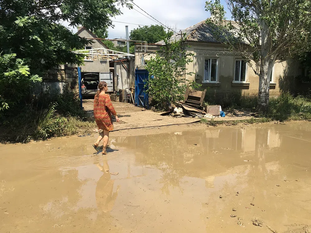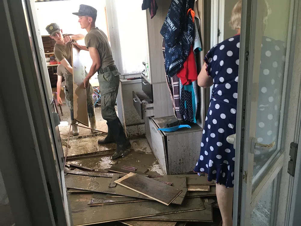 Детей на улице почти нет. Всех увезли к родственникам, которых не коснулась стихия. Иногда прохожие ищут военных и зовут к себе во дворы. По уличной «речке» бродит в шлепках одинокая девушка и кого-то высматривает. Она очень ждет военных с обеда, которые помогли бы ей вычистить внутренний двор.