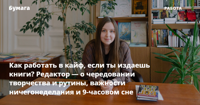 — Мне очень важно отдыхать. Во-первых, если не соблюдать баланс работы и отдыха, страдает работа. Если я люблю свою работу и хочу, чтобы был качественный результат, то отдыхать необходимо, чтобы не пострадали ни я, ни книга, ни автор, ни общее дело. Существуют нормы выработки для редакторов, корректоров, мы строим издательский процесс на их основе.