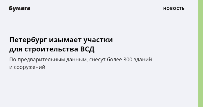 Как пишет «РБК Петербург», по предварительным данным, перед строительством ВСД на этих участках предполагается снос 232 зданий и 109 сооружений, а также вырубка деревьев.