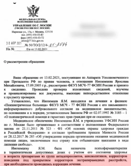 Ответ ФСИН, в котором служба подтверждает применение сильнодействующих веществ к подростку Ярославу Иноземцеву еще до решения суда о принудительном лечении. Документ предоставлен стороной защиты