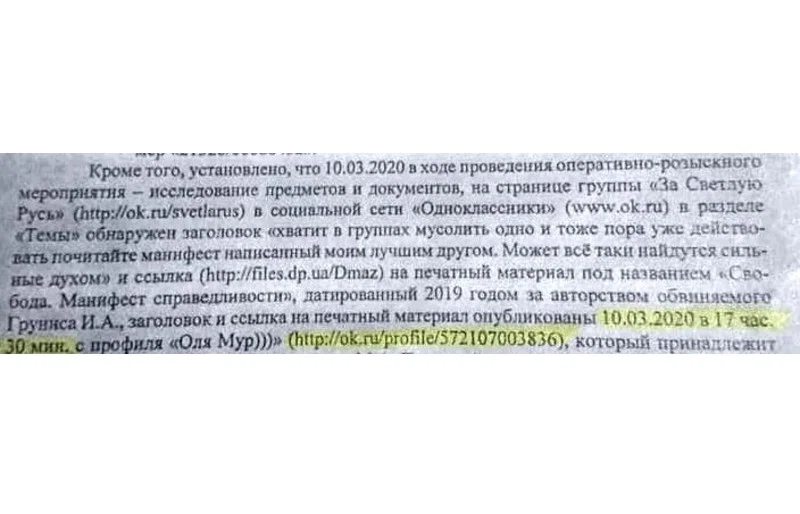 Когда дело только появилось, из материалов следствия было не вполне ясно, как именно «распространялся» тот самый манифест — в личной переписке или же в соцсетях. В документах экспертизы Следственного комитета говорится, что, по версии следствия, Максим Пудовкин с аккаунта «Оля Мур» якобы выложил ссылку на скачивание манифеста в группе «За светлую Русь» в «Одноклассниках» и сопроводил ее подписью: «Хватит в группах мусолить одно и тоже пора уже действовать почитайте манифест написанный моим лучшим другом» (орфография и пунктуация, приведенные в материалах дела, сохранены).