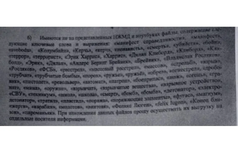 Следователь также попросил эксперта поискать в устройствах подростков упоминания имен массовых убийц: Андерса Брейвика, устроившего теракт в Осло, Эрика Харриса и Дилана Клиболда, расстрелявших учеников «Колумбайна», керченского стрелка Владислава Рослякова. Кроме того, сыщики пытались отыскать на компьютерах парней слова и аббревиатуры «бомба», «стрельба», «школа», «техникум», «СВУ», «ФСБ». И, как утверждает эксперт Русских, отыскали 152 файла. Что это за файлы и каково их содержание — в заключении эксперта не говорится.