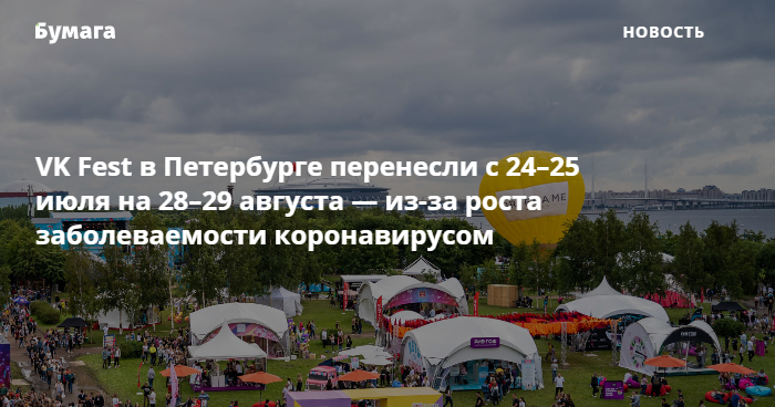 Музыкальный фестиваль VK Fest, который должен был состояться 24 и 25 июля, предварительно перенесли на 28 и 29 августа, сообщили «Бумаге» в пресс-службе «ВКонтакте». Решение принято из-за роста заболеваемости коронавирусом в Петербурге и других городах России.